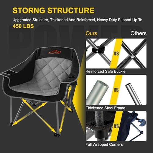 **FAIR WIND Oversized Padded Camping Chair – Heavy Duty Quad Fold Arm Chair Portable for Outdoor – Supports 450LBS, Black**